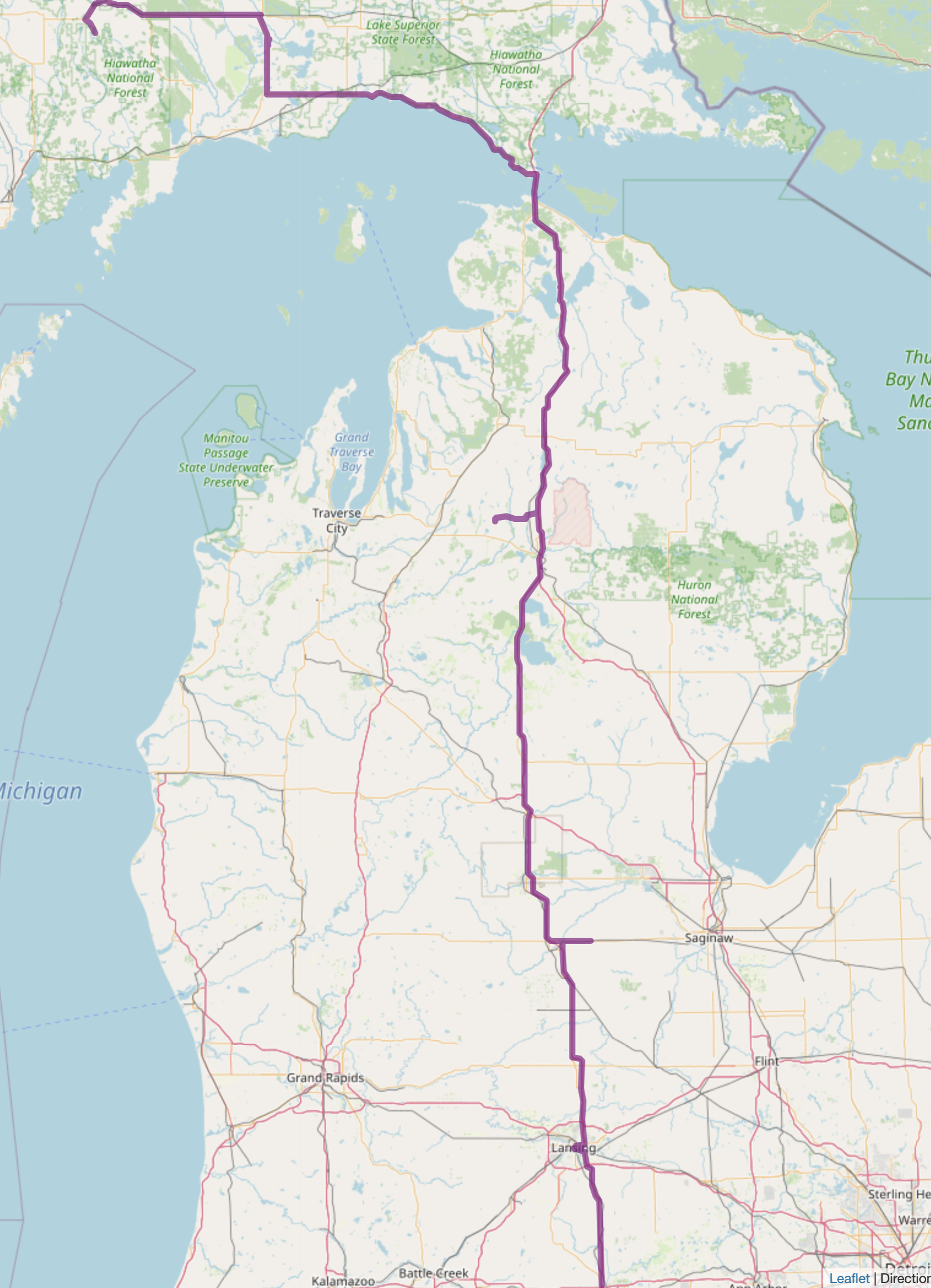 Looking at the straight-line route, the obvious detours would include a stop in Lansing (to visit a state capital) and Mackinaw City for dinner. State forests and Hiawatha National Forest would offer dispersed camping options.