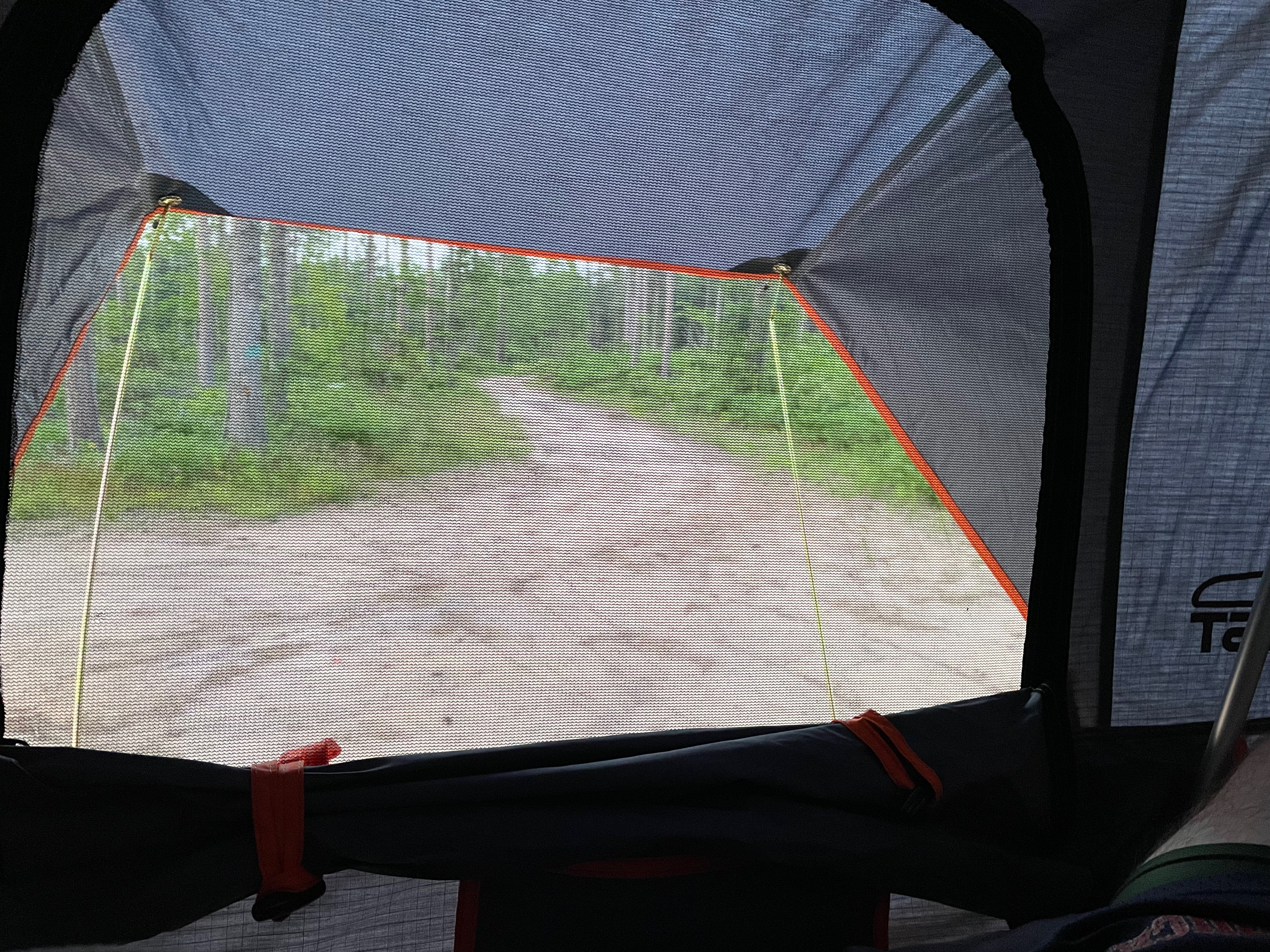We stayed, but it was not a good night. The black flies were awful, making the even brief time outside the car very challenging. Thank goodness we brought head nets with us. We also brought a very large mosquito net that we put over the open trunk hatch while we prepared for the evening. It ended up being a little too large to be manageable, but it was necessary for the evening. We quickly clamored up into the tent for the night, glad to have escaped the black flies. Unfortunately, the mosquitoes found us and made for a sleepless night (either they came into the tent with us when we first got in or we failed to close something, and they found the opening).
