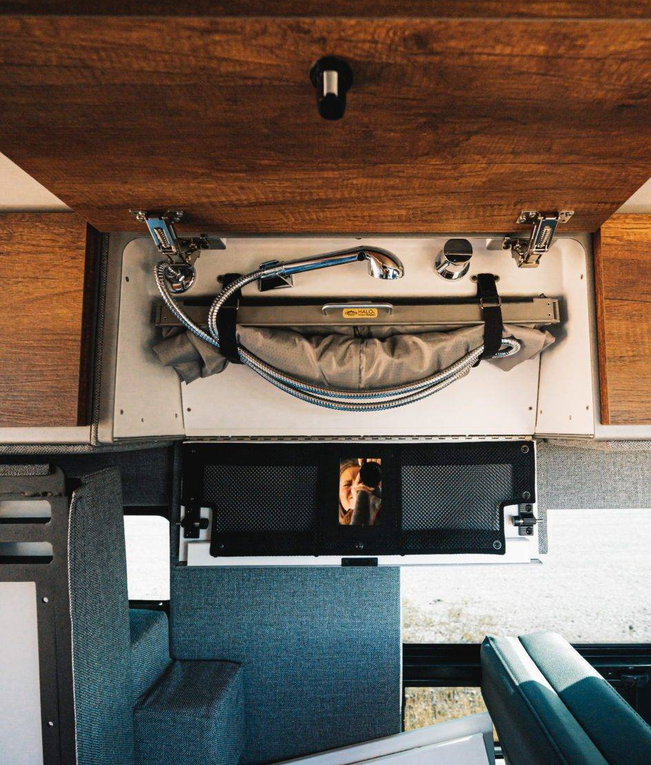 Have you wondered about the bathroom? We noted that there is no wet bath but never said anything about no bathroom at all. What about a shower? This is one of the coolest things we have seen in a camper van – who comes up with these things? Storyteller has hidden a shower inside this van – the shower head, curtain, and faucet are all hidden in an upper cabinet.