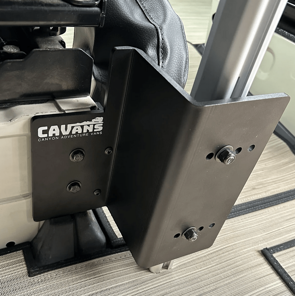 ★Console Table Bracket: The Storyteller comes with a Lagun table mounted behind the driver seat along the side wall. When in motion or otherwise not being used, the table is disassembled and stored securely between the FlexSpace and the GrooveLounge. Unfortunately, in order to be able to lower the GrooveLounge, the table cannot be mounted. CAV addressed this issue by creating a bracket with a Lagun mount that attaches to the back of the driver seat. Not only does the location permit the GrooveLounge to be lowered while the table is in place, the driver seat can still swivel. Brilliant! ($274 as of May 2024.)
