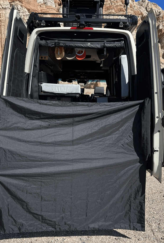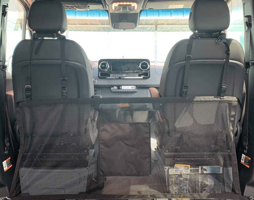 ✔️Sprinter Van Mesh Dog Barrier: One concern we have is preventing the pups from coming up into the driving area. In our daily driver, they’re not permitted to come through the center console area, and the separation between the back seats and the front helps with that. However, there is wide open space in the Sprinter to allow for easy passage back, which means the dogs have easy passage forward. Maybe a small cooler will be the solution, but we also saw this, which looks like it would work well. It also appears that it can be used with the seat organizer. ($169.99 as of May 2024, on sale.)