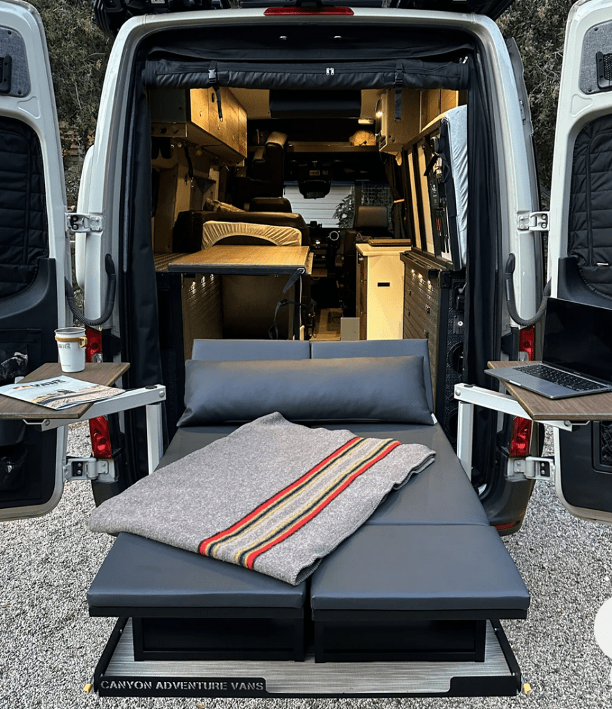 💲Sunset Lounge System – SLS: This is another one that just causes us to shake our heads. Cool in concept? Absolutely. Necessary? Most definitely not. Turns the garage area into a lounge space and, when paired with CAV’s slide out deck (another $2,300), can be slid out the back of the van to let you lounge outdoors. ($4,495 as of May 2024.)