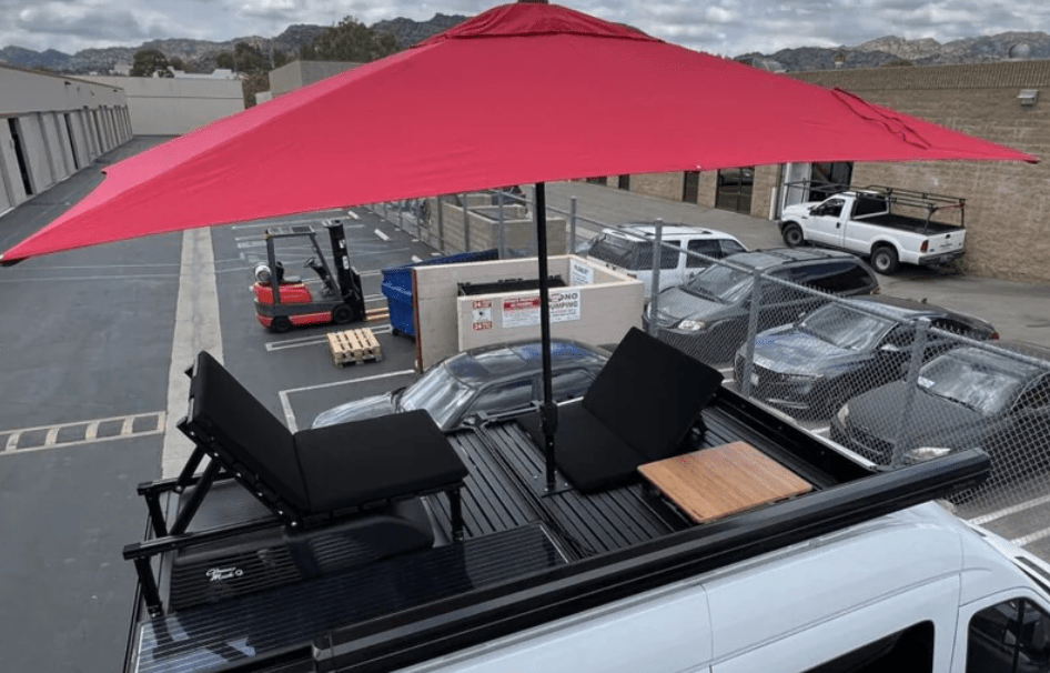 💲Upper Deck Seating System – UDSS: We don’t know whether to laugh or be impressed. CAV came up with a seating module for the roof! Complete with mounted chairs and an umbrella (which also has a small solar panel to power the integrated LED lights). Wow. ($3,995 as of May 2024.)