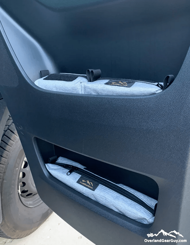 ★Sprinter Storage Cubby Pouches – Set – Sprinter Door Cubbies: Have you put stuff in the door only for it to drive you nuts as it rattles around when you drive? These pouches seem like the perfect solution for that first-world problem while also offering the convenience of being able to keep things neat and tidy and organized. Comes as a set of three: two 8″ pouches for the upper cubby and one 16″ pouch for the lower cubby. Both are 3″x4″. Do we buy the same color for these pouches as for the seat organizer or opt for something new? ($79.99 as of May 2024).
