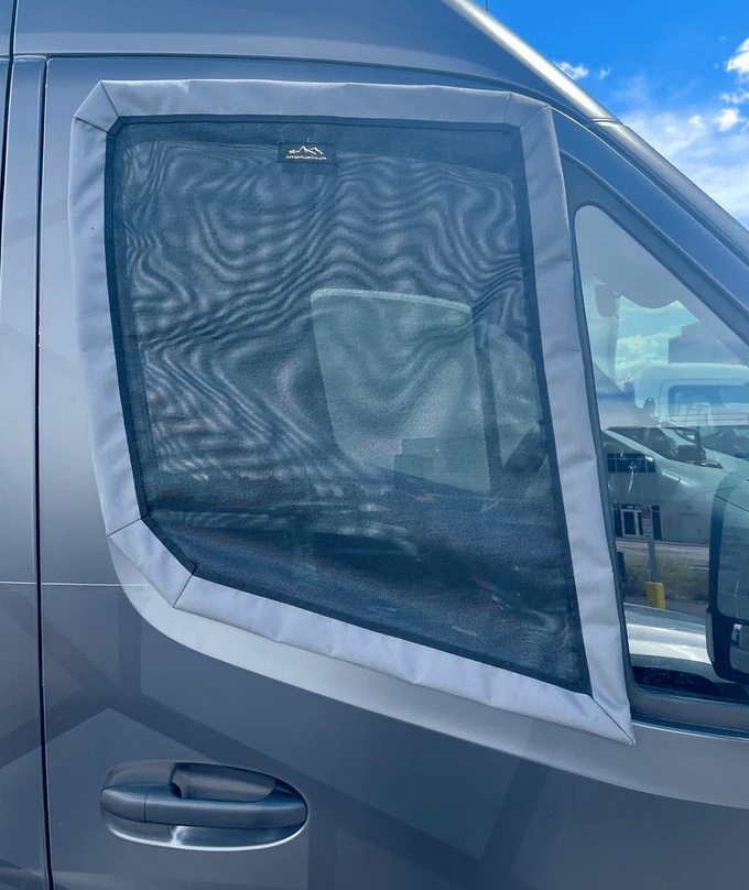 ✔️Sprinter Van Front Driver / Passenger Window Mesh Bug Screen: Airflow in the van will be critically important. We know that there are already plenty of opportunities for that, but these clever little attachments will allow the driver and passenger windows to be down, while protecting against bugs. The camper van we rented in New Zealand had something similar, and they were amazing for making the nights way more comfortable. We still need to evaluate options. This product comes as a set of two, one for each door and magnetically attaches to the outside. ($249.99 as of May 2024).