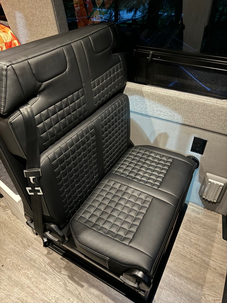 We show up at our appointed time and are taken to the vehicle – which is in the showroom, plugged in, with all the amenities on display. There’s even a literal red carpet laid out along the side. Then begins the walkthrough – here’s all the systems and how they work. We had studied and read ahead of time (of course) so came prepared with a checklist of things. We also recorded a bunch of the walkthrough and explanations. It was highly recommended and seemed to make sense at the time, but I’m not sure we’ll go back and watch them. Who knows?